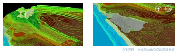 LIDAR技术对于河流监控与治理有着极其重要的意义。由于LIDAR数据构成的三角网高程值可以用某一颜色赋值渲染,这样水力部门可以按某一高程值预设一颜色值渲染,即可直观看出水位淹没的范围又可测算出水位到这一高程时水位淹没的区域面积以及其危害程度。因此,水力部门可以进行有效的水利工程设计,进行河流监控与治理和水灾防治与保险。